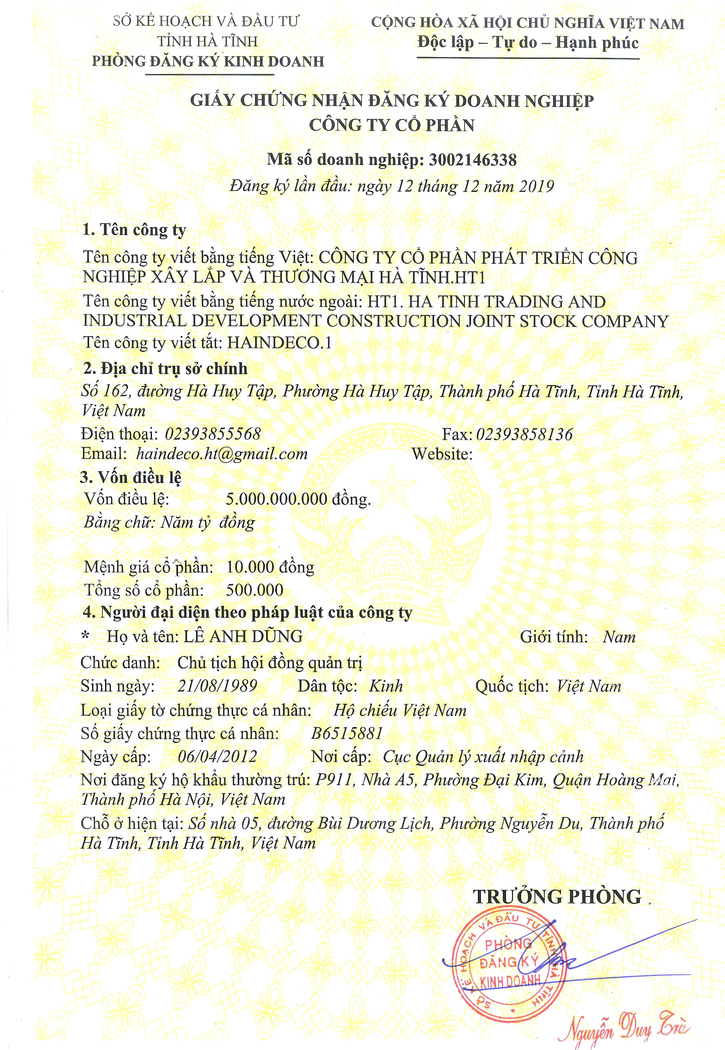 Tên doanh nghiệp viết bằng tiếng nước ngoài: HT1. HA TINH TRADING AND INDUSTRIAL DEVELOPMENT CONSTRUCTION JOINT STOCK COMPANY